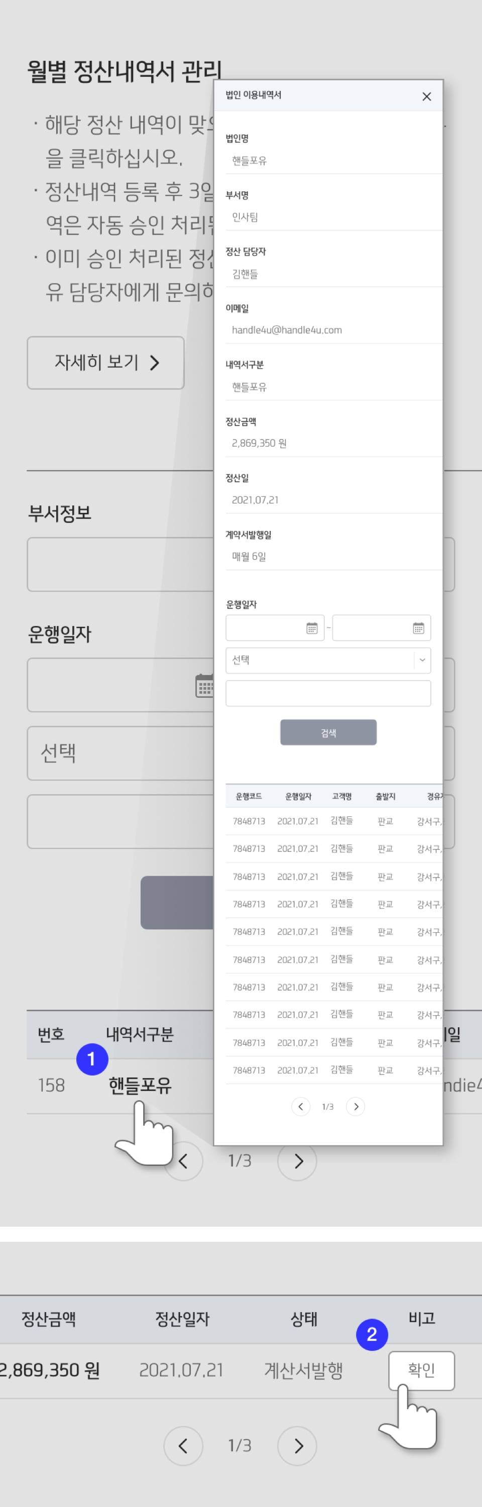 등록된 정산내역은 법인 담당자의 승인 절차를 통해 핸들포유에 통보됩니다.